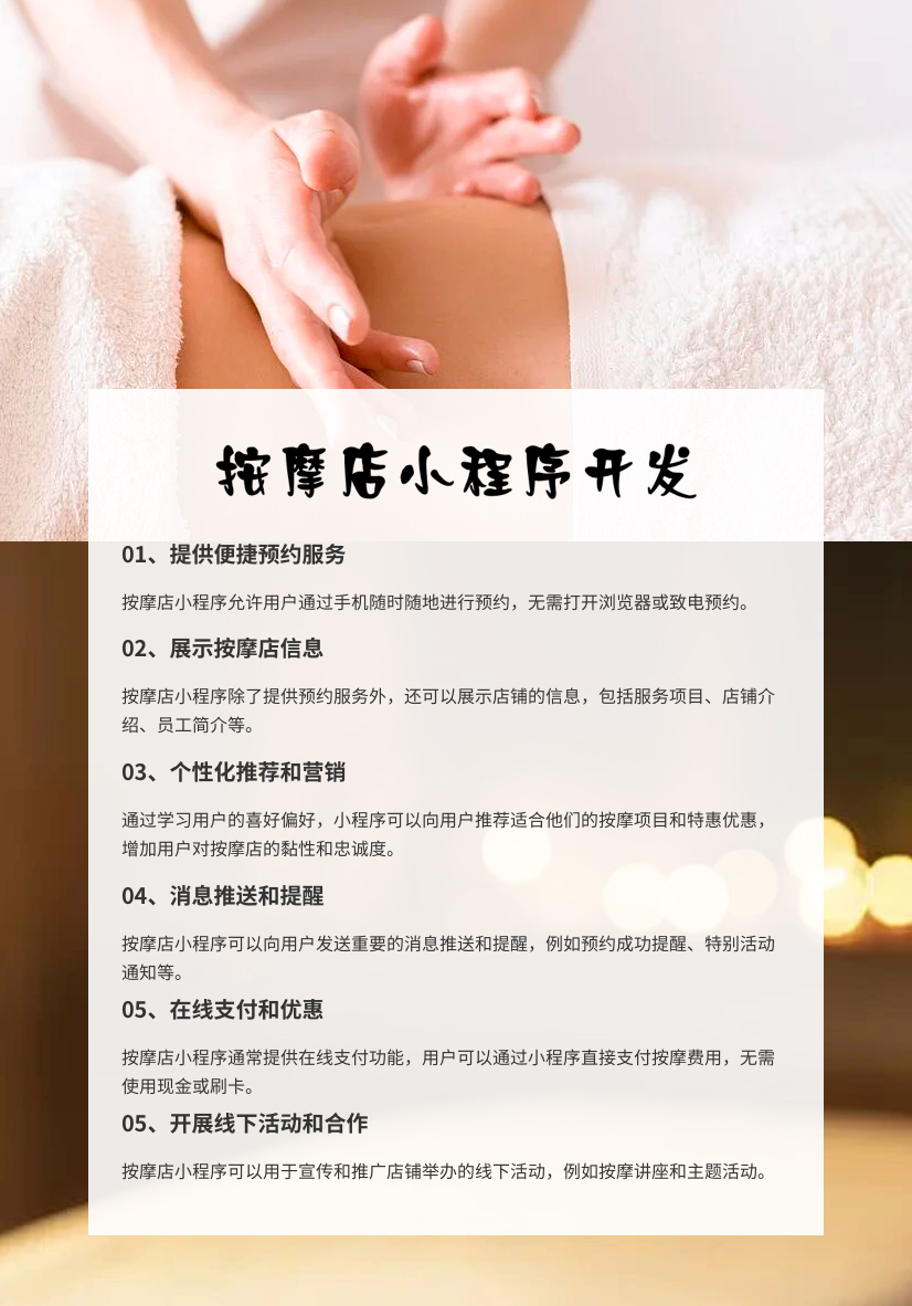 在快節(jié)奏和高壓社會(huì)中,按摩已成為許多人緩解壓力和保持健康的重要方式,各地的按摩店也是隨處可見,而為了能夠更好地提供服務(wù),很多按摩店都引入了小程序應(yīng)用。