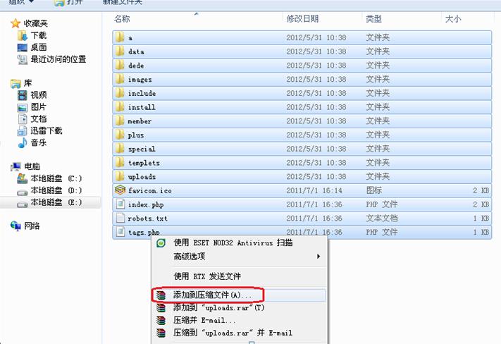 進(jìn)入源代碼文件夾,將所有的文件和文件夾選中,選擇“添加到壓縮文件”。
