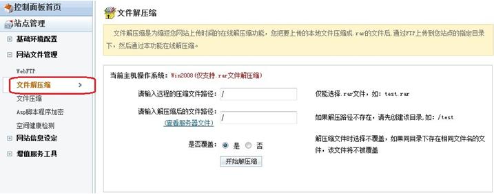 使用主機(jī)管理賬號(hào)密碼,登陸萬網(wǎng)虛擬主機(jī)控制面板http://cp.hichina.com/,選擇其中的“網(wǎng)站文件管理”==>“文件解壓縮”,然后按照提示操作。