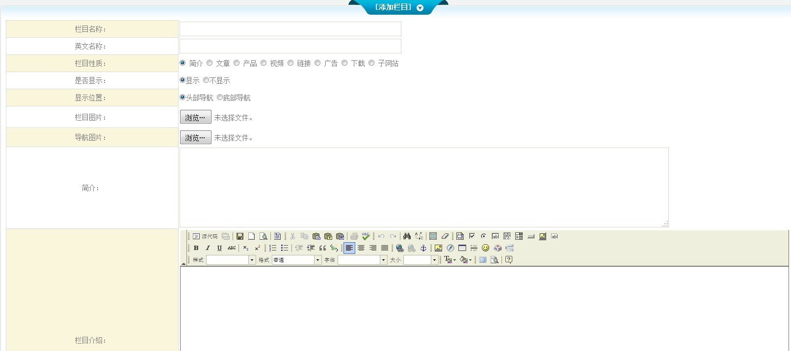 1、將您要添加的欄目名稱、英文名稱、欄目圖片、導(dǎo)航圖片、簡介、欄目介紹等填寫完成。