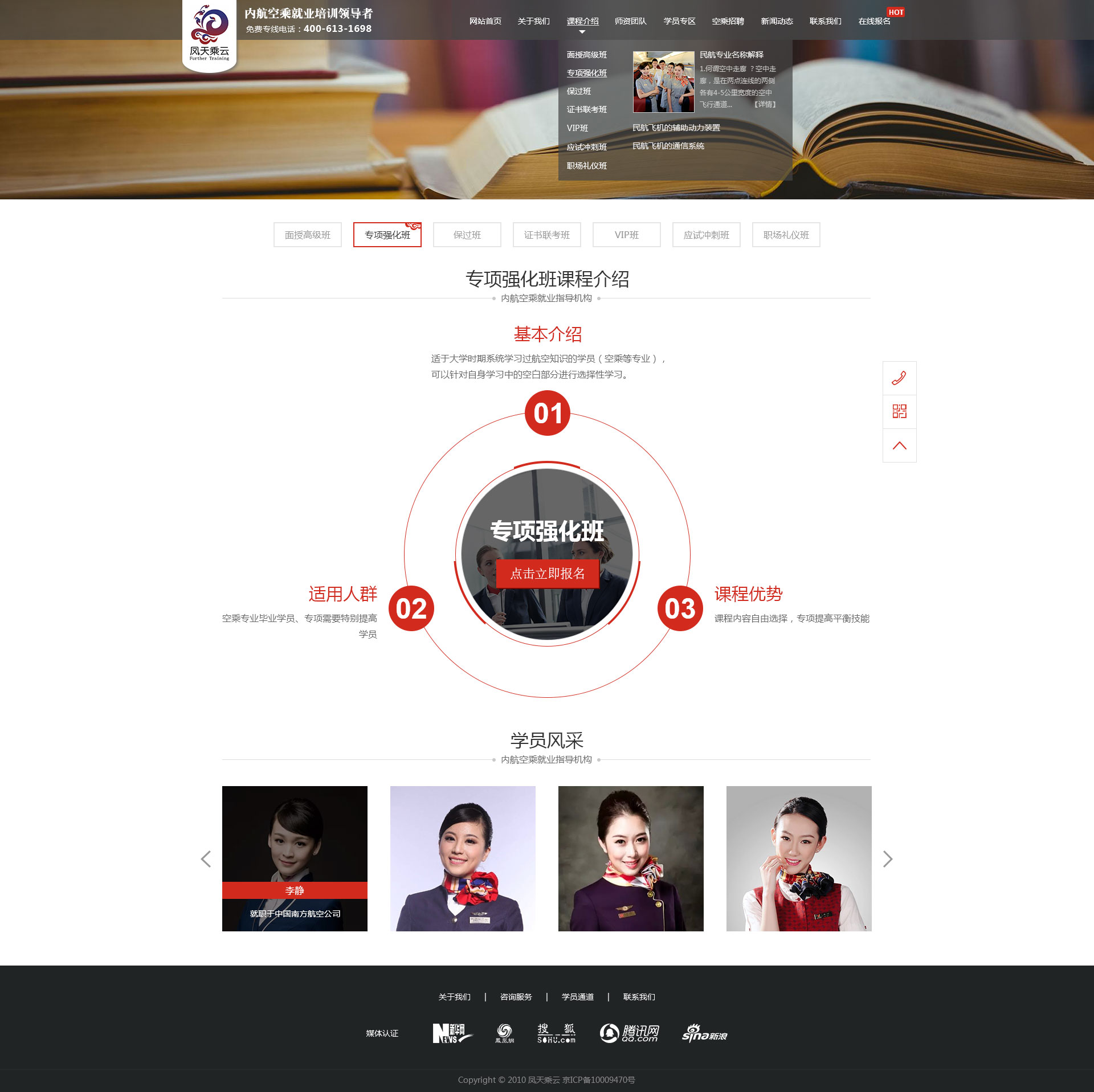 鳳天乘云是內(nèi)航空乘就業(yè)培訓(xùn)的開創(chuàng)者,全國(guó)授權(quán)開展航空服務(wù)技能培訓(xùn)的權(quán)威機(jī)構(gòu)之一。